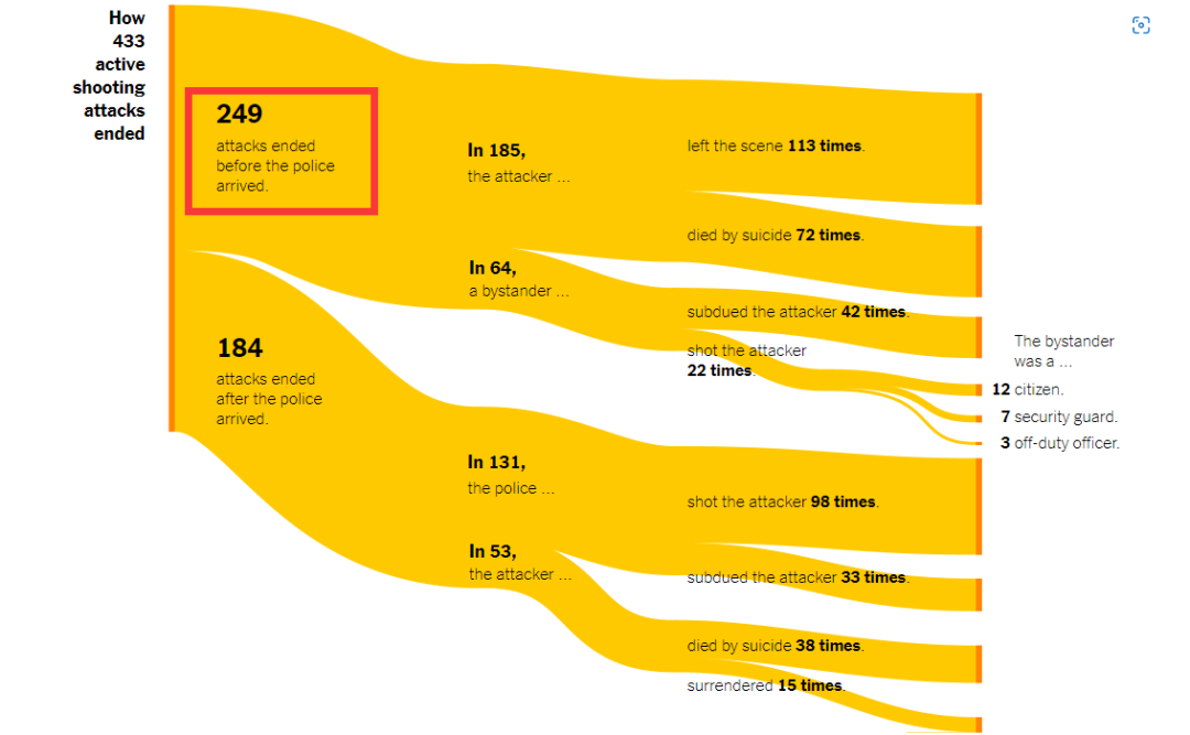 这次事件让美国民众集体破防,许多人因此彻底对警察失去了信心,但在枪击案中,警察能够发挥的作用本就很有限。《纽约时报》的一项研究发现,在美国近二十年发生的四百多起大规模枪击案中,大多数时候警察还没有赶到现场,枪击就已经结束了。