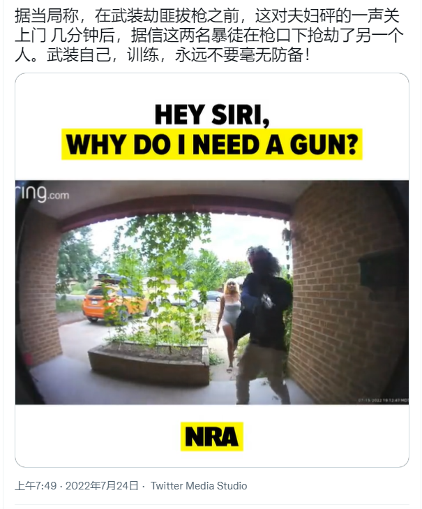 比如NRA就制作了许多颇有说服力的广告,经常把一些真实发生过的持枪歹徒袭击市民的监控录像,配上“为什么你应该买枪”、“如果没有枪会发生什么?”等文字发到社交媒体上,以激发家长、女性等群体的恐慌,唆使他们去买枪。