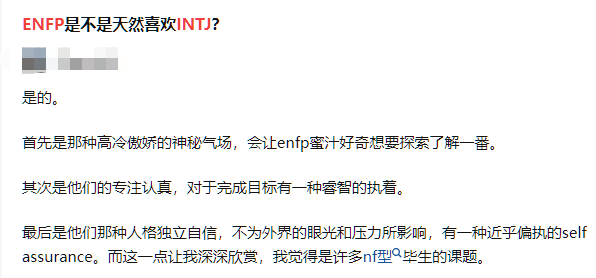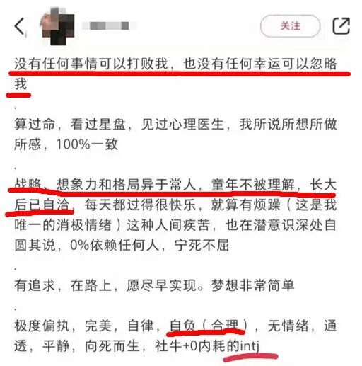 这种“MBTI带给我的自信”,一直持续到我看到了一位朋友发表的帖子,这种似乎“完全符合INTJ倾向”的自负劲儿直接给我干沉默了。
