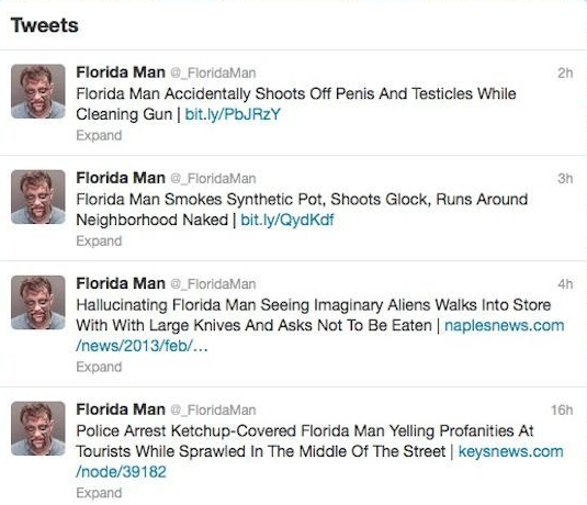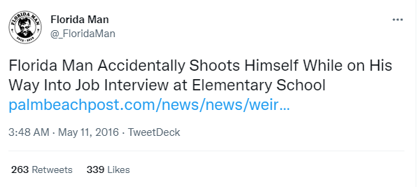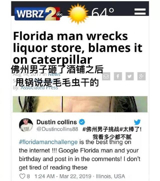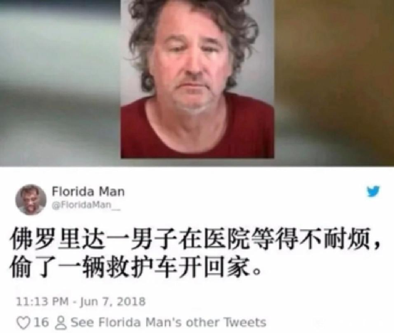随后,他以“Florida Man+XXX(奇葩行为)”的格式,接连发布佛州人的糗事。