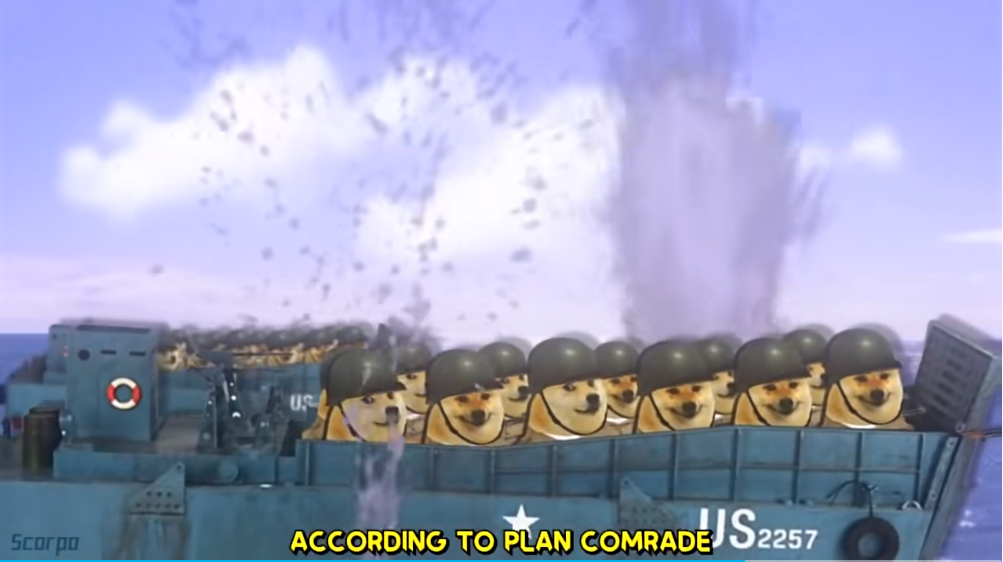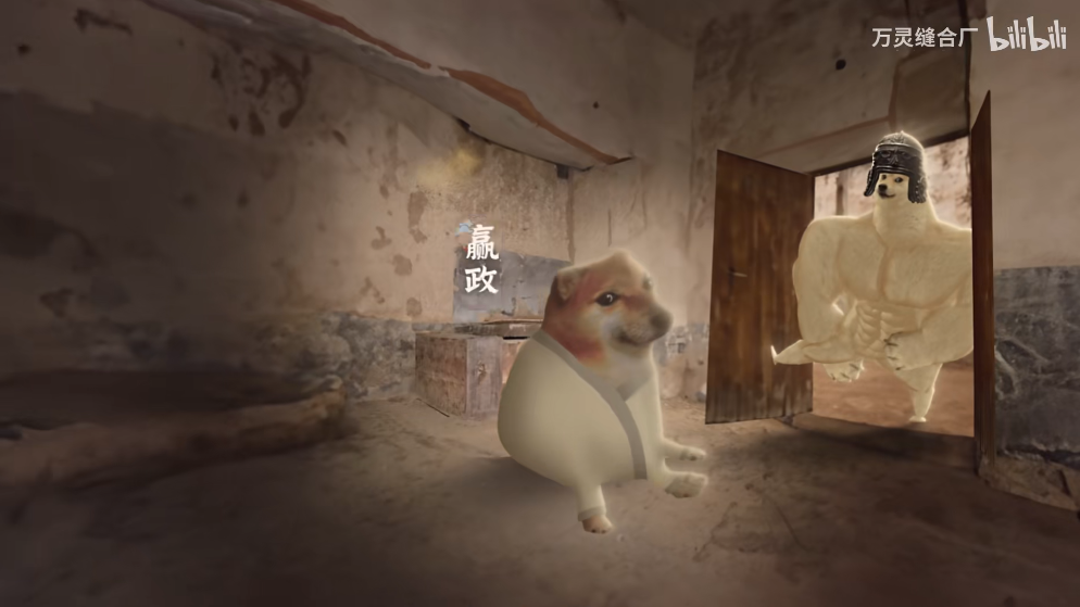 就比如这些模因历史视频的常用“演员”cheems,一只瘫坐在地的颓废小狗,贴上小胡子它就是落榜美术生,带上钢盔它就是某国的士兵,穿上简陋的布衣它是幼年嬴政,拿上燕国地图它就是刺客荆轲……