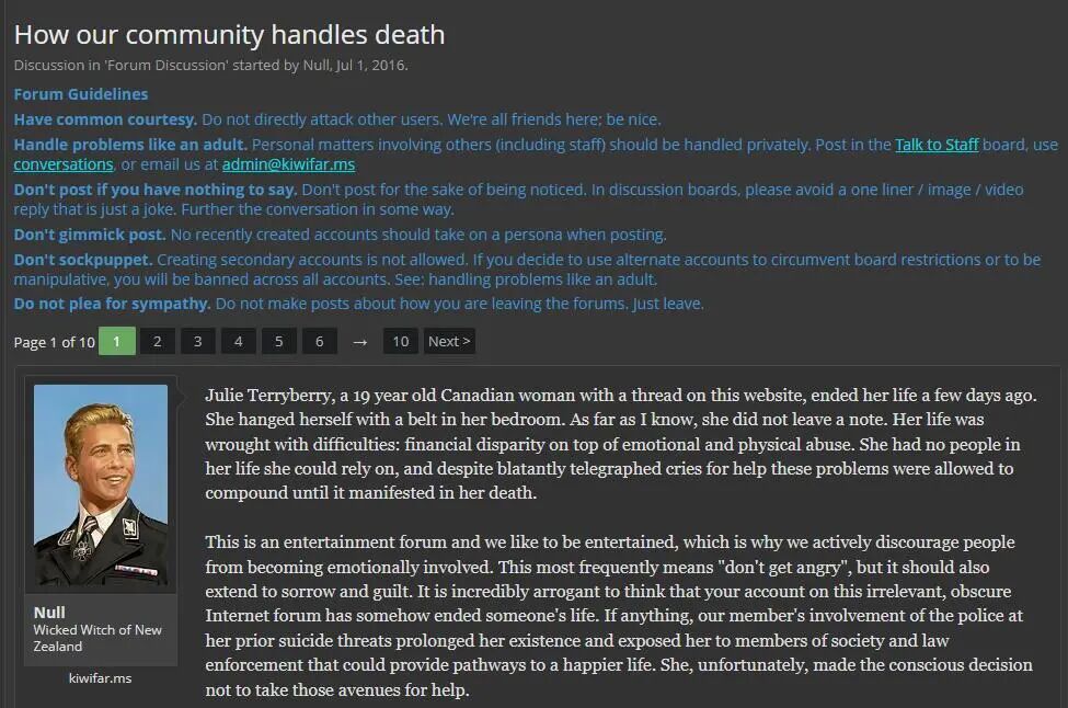 在2016年,在一名拥有学习障碍的19岁女孩Julie Terryberry,因为长期被Kiwi Farms骚扰上吊自杀后,Kiwi Farms创始人Joshua Moon就发长文来“安抚”成员们有些不安和自责的情绪: