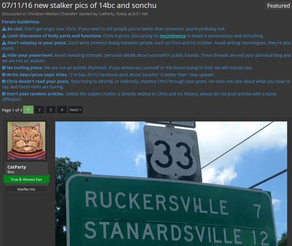 对于那些想看乐子的人来说,Chandler简直就是个活宝。4chan和Encyclopedia Dramatica很快就不能再满足Chandler“狂人的粉丝”,——于是Kiwi Farms就诞生了。