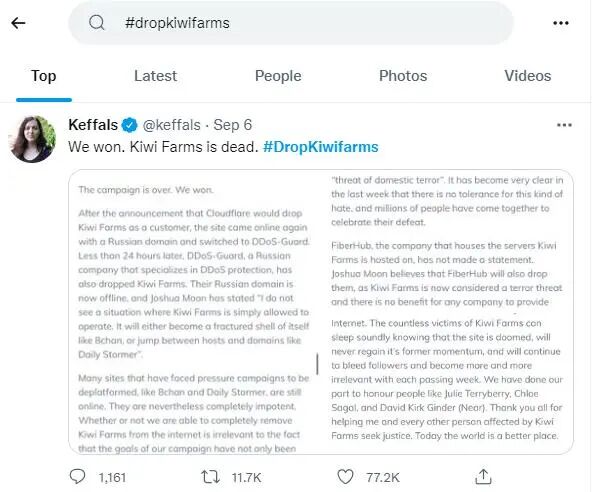 “我们赢了,Kiwi Farms死了”