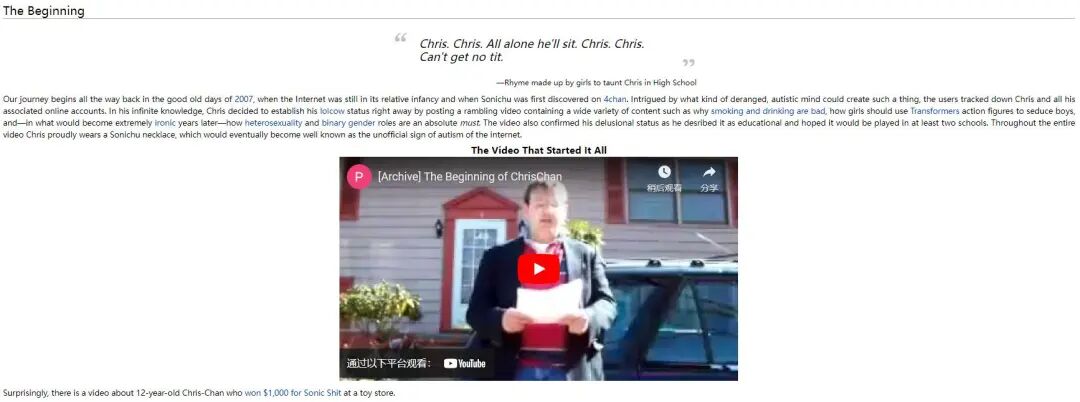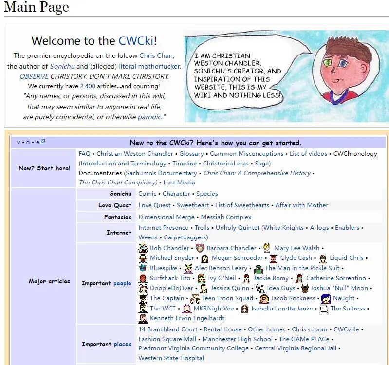 当Chandler的猛料越来越多后,有人开始在著名的恶搞百科Encyclopedia Dramatica上创建了Chris-Chan的词条,将Chandler的简介、资料进行整理归纳,并创作了大量恶搞图供人“取乐”。