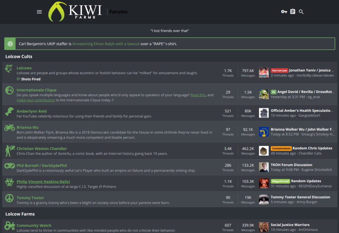 打那以后,Kiwi Farms的行事风格更加肆无忌惮。对于自己只是在网络上搞搞小动作,根本不用负任何责任这件事,Kiwi Farms达成了一致。