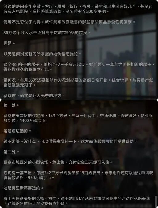 在剧情中,这几位次要主角的表现令人难以共情,当我以为她们不离开娼馆是因为会受到老板的死亡威胁时,她们却又告知玩家“写一封离职申请书就行,不走是因为想攒买房钱”......