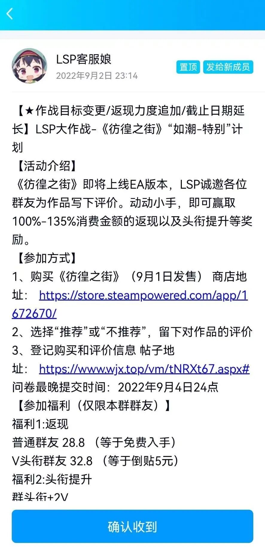 但与此同时,有人爆出了它的发行商LSP企划屋鉴赏家群中的消息,他声称发行商LSP举办了一场名为“如潮-特别”的宣发活动,为那些在steam上打出好评的玩家返还游戏的全额购买费用,这场活动的效果立竿见影。截止于9月9日,即便面对玩家的诸多质疑,《彷徨之街》仍保持在“多半好评”(78%)。