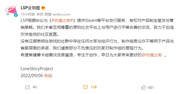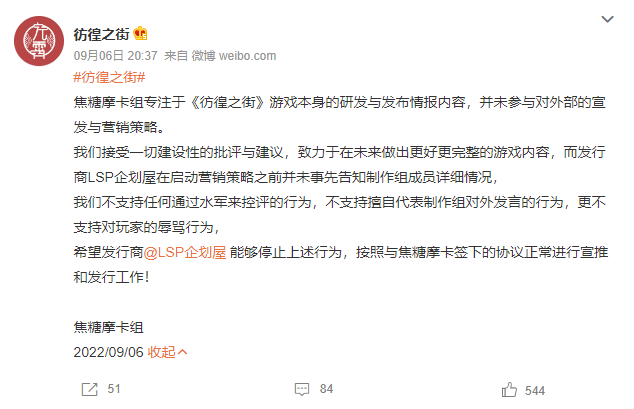 9月6日,《彷徨之街》的制作组焦糖摩卡发文声称他们并未参与游戏的营销内容,试图与发行商LSP划清界限。