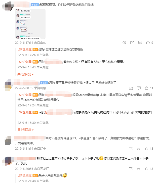 与此同时,LSP企划屋的客服仍在他们管理的QQ群辱骂那些发表质疑的玩家,微博运营人员也没有停止对玩家的冷嘲热讽。