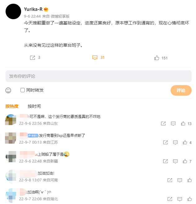 这一切都让游戏的制作组与发行商之间的关系迅速分崩离析,“我从没有见过这样的草台班子”,《彷徨之街》的主创Yurika-R在微博如此声明,并声称打算推翻重做《彷徨之街》的基础设定。