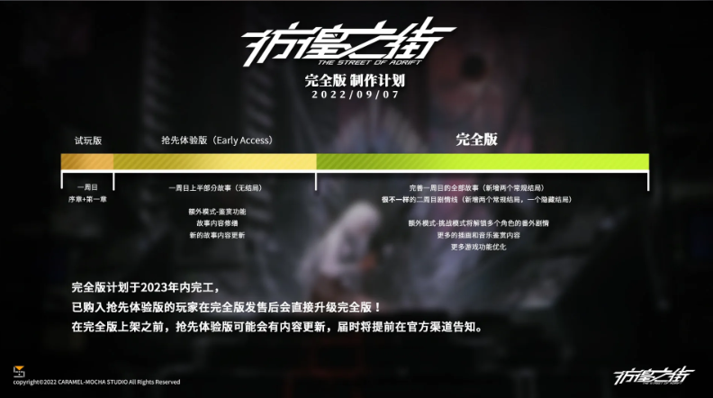 9月13日的下午四点左右,《彷徨之街》在steam界面上发布了他们的更新计划,制作组焦糖摩卡声称游戏的完整版将于2023年内完成,而此时玩家们玩到的版本只是游戏的“一周目上半部分”。
