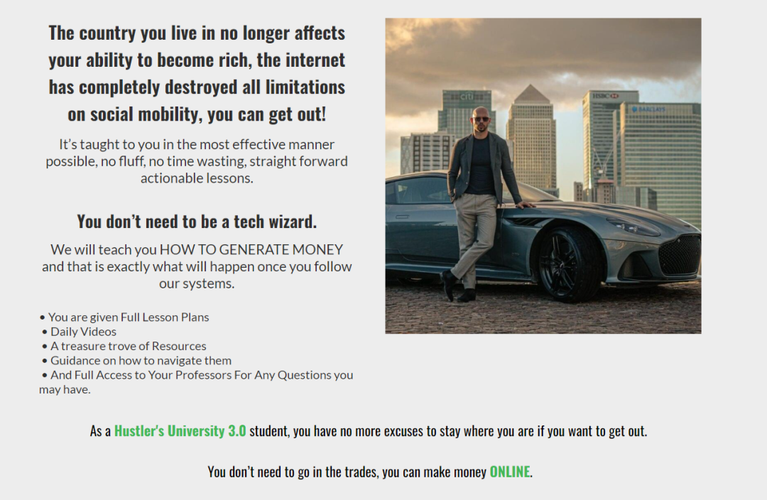 除了前搏击运动员、网红,Andrew还有另一层身份:Hustlers University(HU)的创始人,不论从哪个角度来讲,hustler都不是个好词,但在Andrew的名义下,一切又是那么地顺理成章。不过,这都不重要,重要的是它很火,而且很赚。
