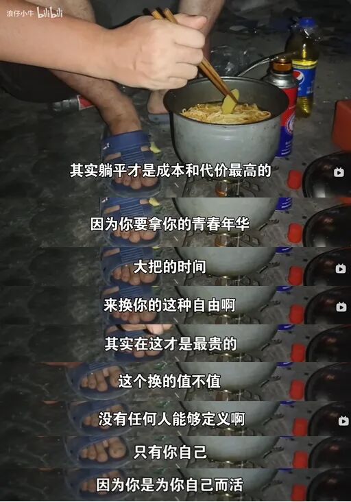 尽管在视频里自称“三和大神”,但牛少没打过几天工。他应聘过地铁保安、快递分拣员等一些听上去还算体面的工作,但要么被拒,要么因为办事效率太低而在上班的头一天就被辞退。不过,牛少进厂不顺也和他抗拒工作的观念有着莫大的关系。在拿到一份每月4000左右,但要上12小时班的工作后,他思索再三,最后还是放弃了这个机会,在安逸稳定、循规蹈矩的社畜和颠沛流离、来去自由的流浪汉之间,牛少选择了后者。