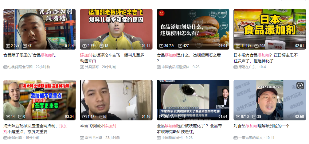 当今市面上的大部分添加剂本身合法合规,只要按国家标准使用,远称不上“有毒”,但由于辛吉飞在视频中,用香精的时候带一句“哎妈呀辣眼睛”,加色素的时候补一声“放多了倒沫子(口吐白沫)”,放味精时说“头发吃光光”,加上在人们对添加剂本身的刻板印象,这种焦虑感无疑会被放大。