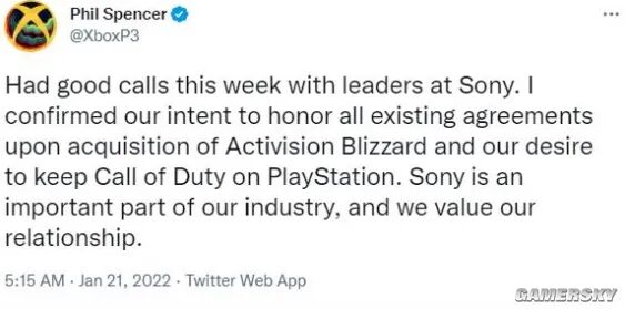 微软游戏部门主管Phil Spencer在推特上主动表示自己刚和索尼高层进行了对话,确认《使命召唤》会继续留在Play Station上:“索尼是行业重要的组成部分,我们很珍惜我们之间的关系。”动视暴雪当时也立刻站出来给索尼吃定心丸,表示收购完成之后不会在任何平台上移除已有的游戏。