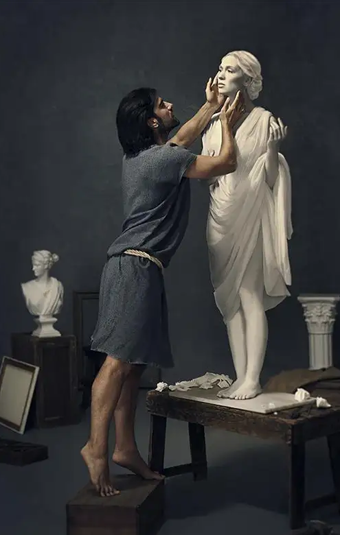就像在希腊神话中,一位名叫皮格马利翁的国王亲手雕刻了名为“阿狄丽娜(一译为伽拉忒亚)”的象牙少女雕像,然后无可救药地爱上了她,夜以继日地恳求这座雕像成为自己的妻子。