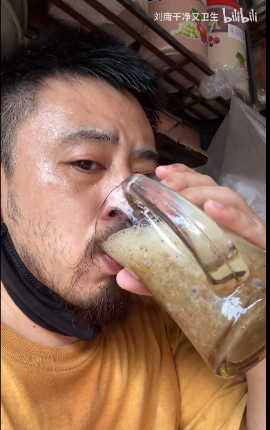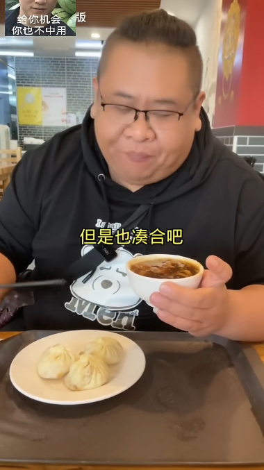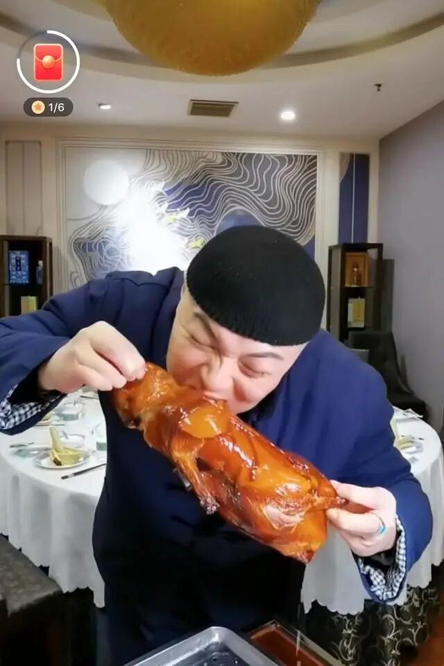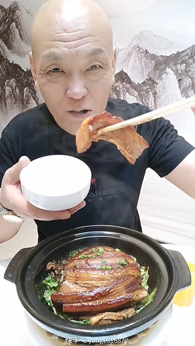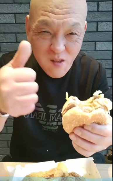 画面中的男人笑嘻嘻地展示着用筷子夹起的吃食,一边往嘴里塞一边说着“那叫一个地道”,还向屏幕前的观众们竖起了大拇指。