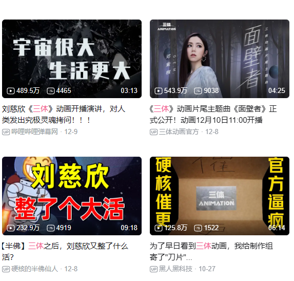 《三体》动画开播前几天,我的B站首页就被各种三体相关的视频刷新了好几遍,从B站官方组织的刘慈欣的演讲、邓紫棋演唱的ED放出,到我关注的up主接二连三地更新三体相关的视频,都透露出一种“大的要来啦!”的风雨欲来之势。