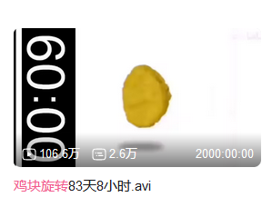 在“十小时鸡块”的一个月后,又有人上传了一个时间更长的鸡块版本——这次是翻了二百倍,直接变成了两千个小时……