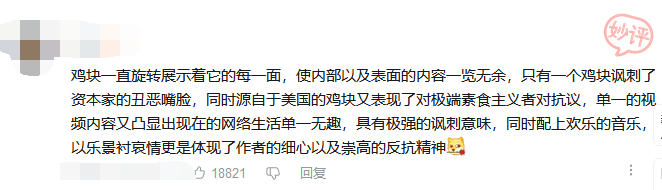 但实际上,二者相去甚远,如果说《山》代表的是安静与沉思状态下的我们,那么旋转鸡块就是速度与节奏快了千百倍、但内容却空虚了千百倍的《山》。在《山》下面,人们会直面内心、参悟万物;但在旋转鸡块视频的下方,人们只会整活与吐槽而已。
