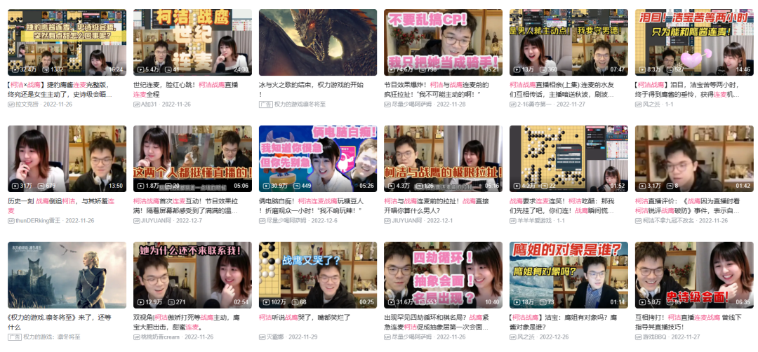 你很难说出战鹰和柯洁粉丝的具体成分,有人为了看棋而来,想从世界冠军这学点技术;有的人乐于玩梗,用抽象文化拷打主播;而即看不懂棋,也玩腻了抽象的人们似乎也有着驻足的理由,谁会拒绝一场围棋少年和直播天才的甜甜恋爱呢?
