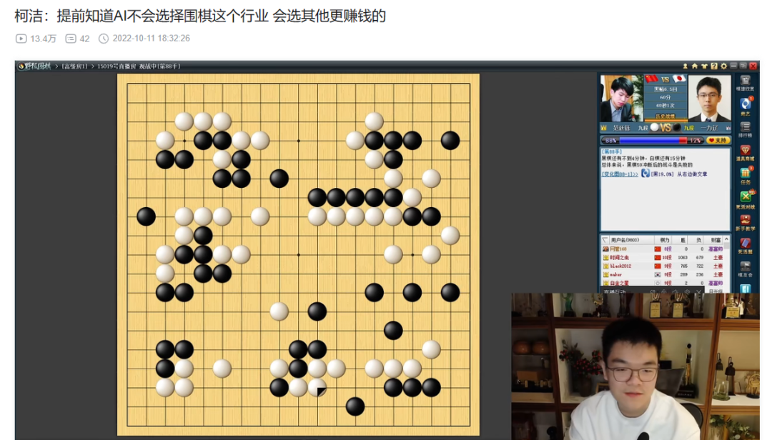 去年一年,柯洁在围棋比赛上的成绩并不算好,颗粒无收不说,下半年还经历了一波连败。这对许多围棋粉丝来说,是不可接受的。人们指责柯洁“捡了芝麻,丢了西瓜”,过度专注于直播整活和商业布局,忘记了自己的立身之本。而被AlphaGo折磨得“道心破碎”的柯洁也坦言,人工智能的引入让他丧失了下棋的热情,自己的初心好像有了动摇。