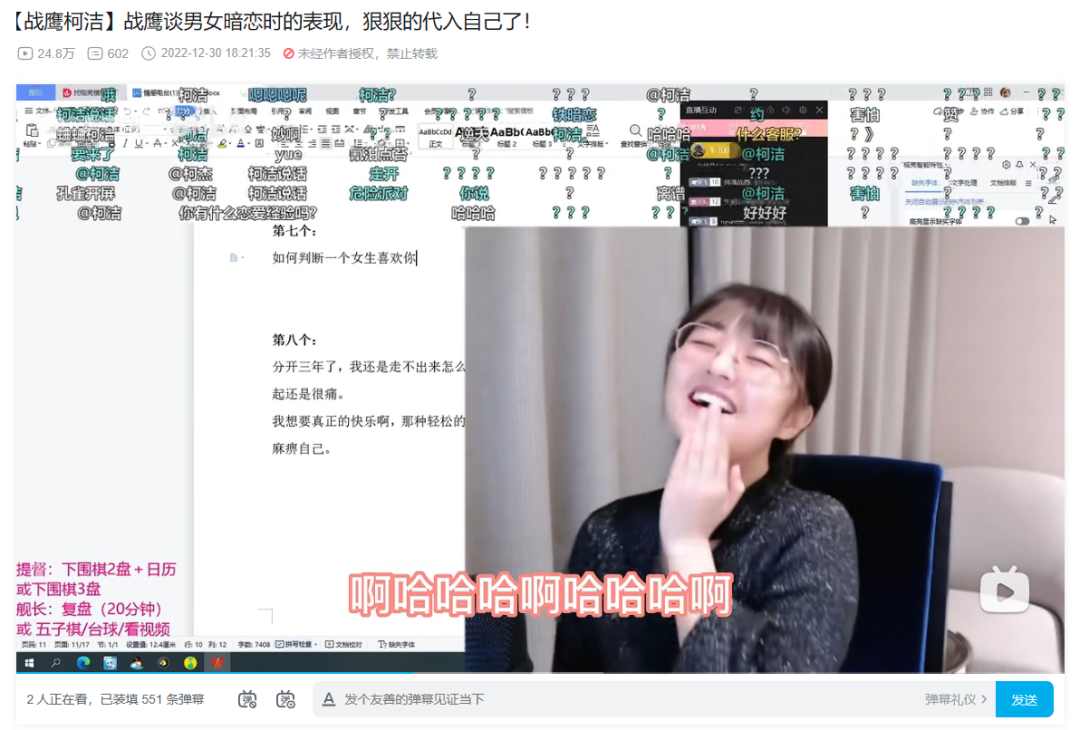 然而与她稍显孱弱的围棋水平相对的(当然,对普通人来讲还是降维打击的),是极高的直播天赋。自从读贴吧锐评破防痛哭的视频破圈后,战鹰的直播就像她的名字一样一飞冲天,截止到今天,战鹰的舰队人数已经达到了1545人,冲进了B站主播前十,而她较火的二创视频的单个播放量也以百万计,不逊色于大司马等一些老牌知名主播。可以这么说,战鹰在副业直播上的成就,已经超过了她作为一个职业棋手所达到的高度。