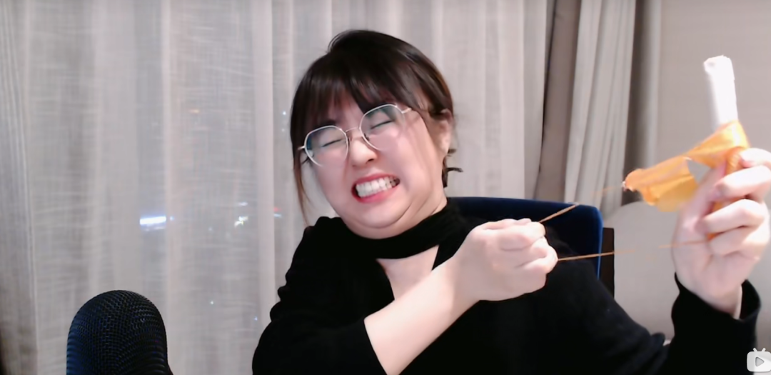 还尝试用火腿肠包装拉弓射箭,表情夸张到叠了三层下巴,并骄傲地向观众展示刚才那骇人一刻的截图。
