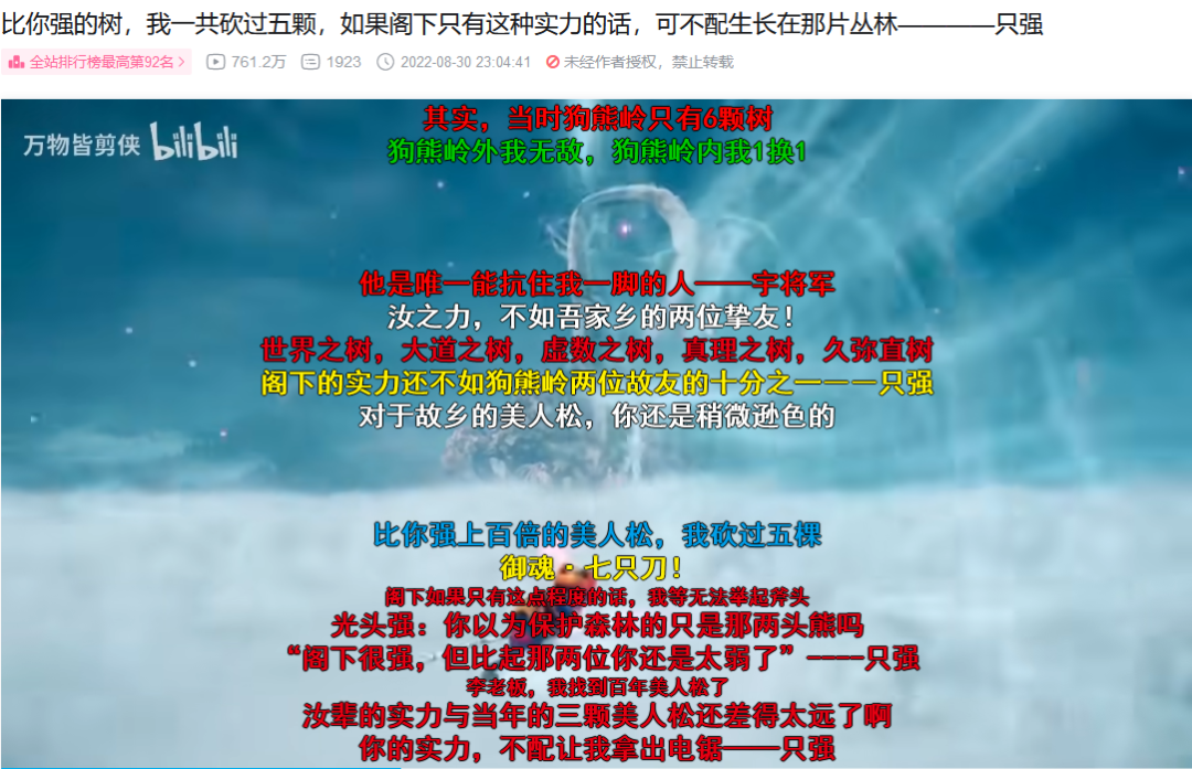 去年八月,有人在视频中,将游戏《只狼》中的主角替换成了《熊出没》里的光头强,并配以诸如“如果阁下只有这种实力的话,可不配生长在那片丛林”等反差与B格十足的文案。