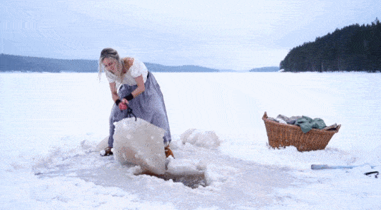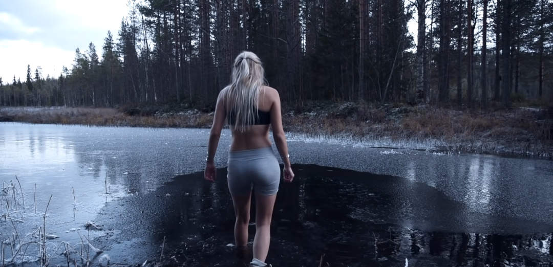 这位金发人妻最为出圈的两个视频,一是在冰天雪地里赤身裸体站立、随后跃入湖中冬泳的福利片段;二是在雪地上凿冰开洞,然后换洗衣服的硬核日常。