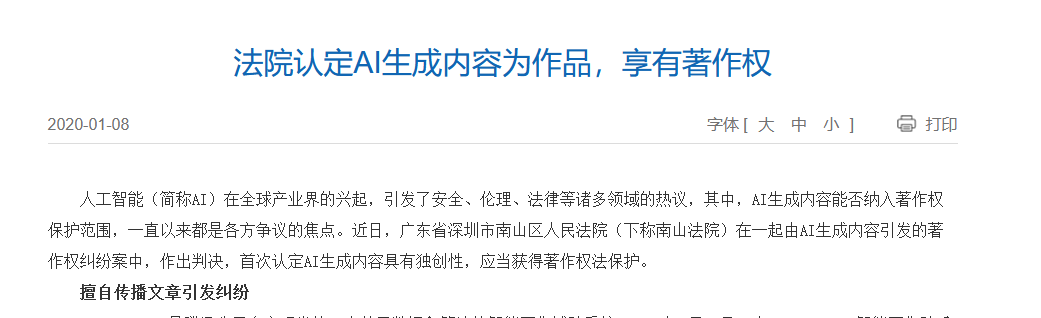 其实在两年前,我国已经有过一个关于AI的法律先例——但这是保护AI生成的作品,而并针对被AI学习的原作品。