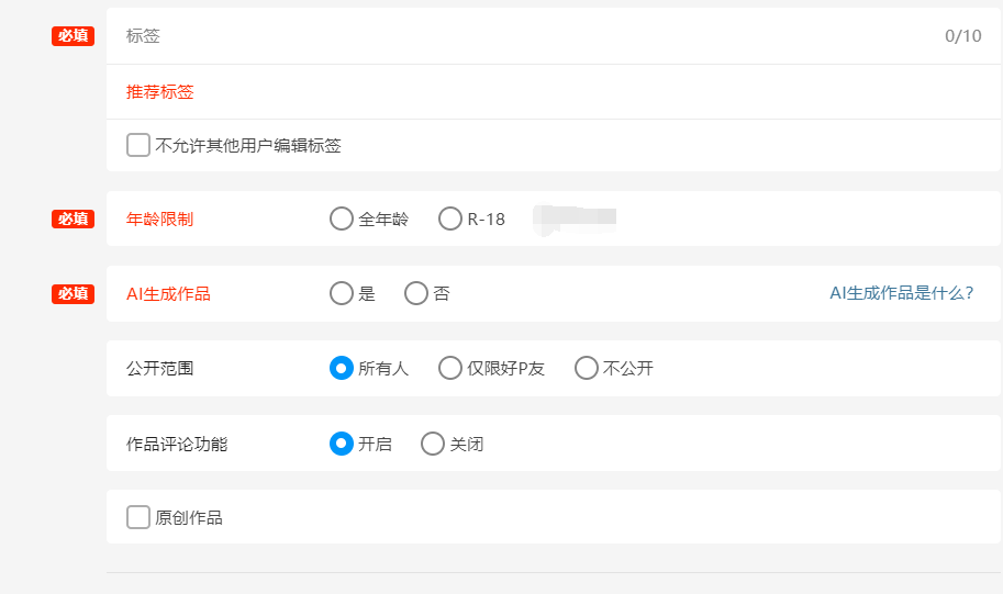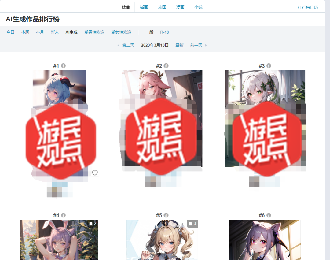 其实从去年十月开始,p站就针对AI作品的泛滥做出了应对。他们将AI作品踢到了另一个榜单,并在画师投稿前增加了“是否为AI”的选项——但当你看过p站的榜单,就会发现这一切有多么恐怖。