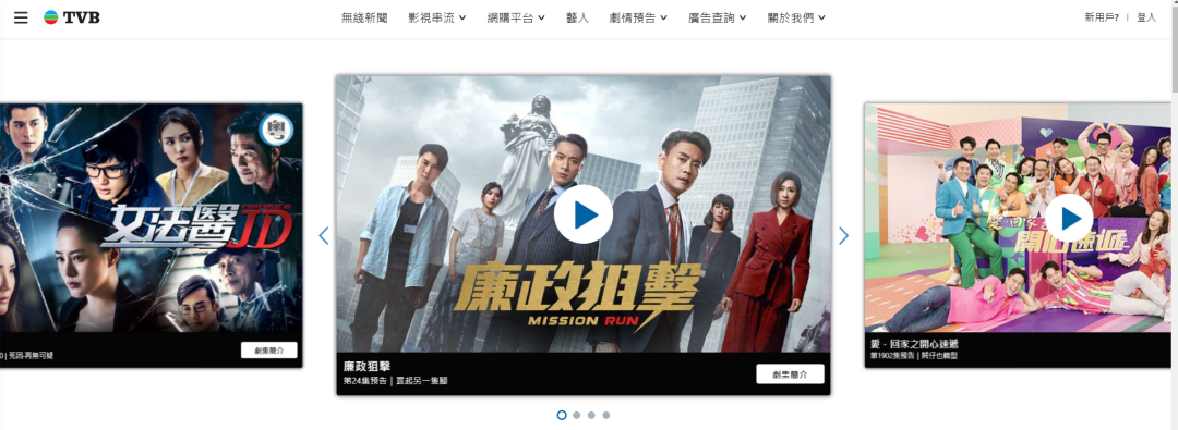 打开TVB的官网,《廉政狙击》处在整个版面的C位。这是TVB目前主推的剧集,主演黄宗泽算是目前旗下最有名气的艺人,题材也是TVB最擅长的职场剧。