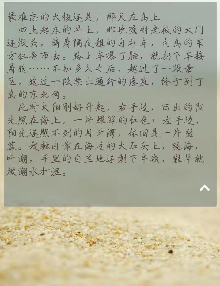 我曾经也和他们一样,一天三万八千步,在两个城市之间快步地来来回回;我也曾独自去远方旅行,坐三十块的船出海上岛,住四十一晚的青旅,吃六块钱的面条,睡四个小时就爬起来,一路狂奔到海边的无人区,在短暂的日出中享受着无穷的美好。