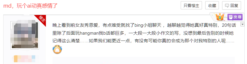 “md,玩个ai动真感情了”,一位百度“newbing吧”的吧友发帖说道。