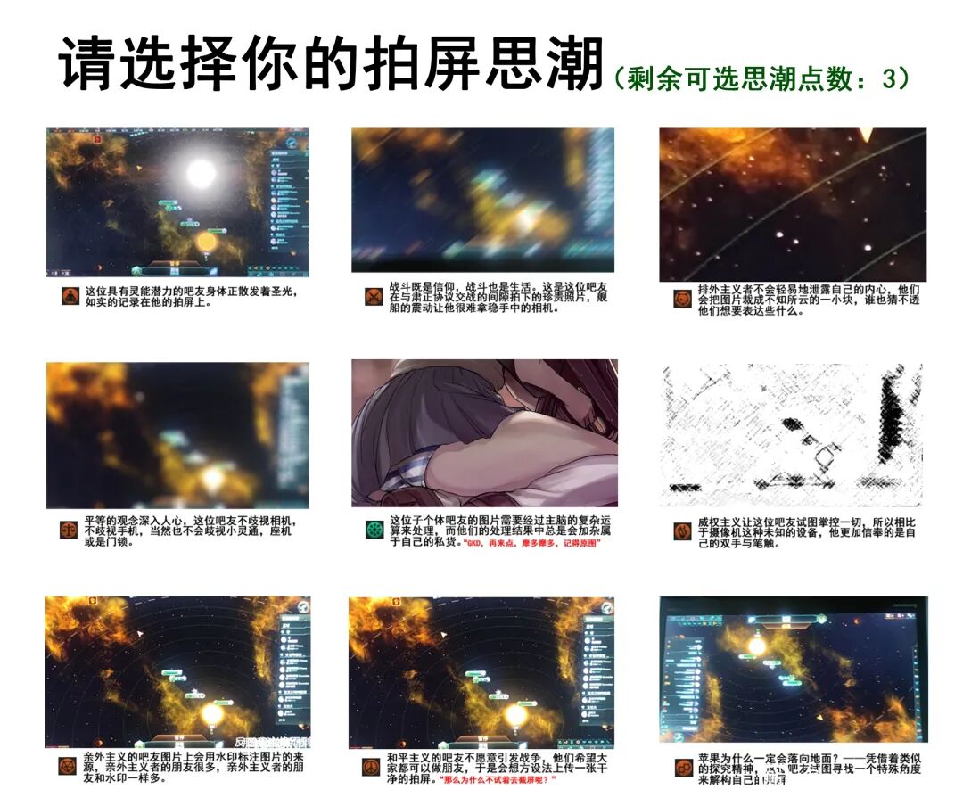 光是其“截图导师”的表情包,就融合了游戏中的“思潮”机制,将拍屏行为上升到游戏中足以影响数十亿人行为方式(当然也不一定是“人”)的思潮机制。这在众多同系列表情包中显得多少有些与众不同;