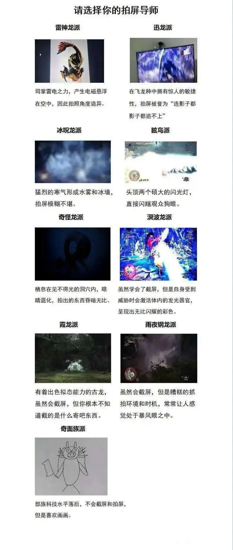 拍屏行为有相似,解构方式总不同。最近让许多玩家肝疼的《怪物猎人:崛起》,其贴吧内就流传着根据怪物的特性定义拍屏方式的表情包。在这里,轮廓模糊的画面被定义成了行动迅速的“迅龙”派;画面昏暗的截图则与视力退化的“奇怪龙”对应;至于那些闪瞎观众狗眼的拍屏图,其背后一定少不了《怪猎世界》中“眩鸟”的汗马功劳。
