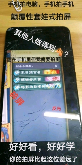 拍屏的花样有千八百种,角度过低或过高、画面太亮或太暗、距离太远或太近……这群拍屏人的拍摄水平就仿佛其游戏技术一样,菜得五花八门、菜得百花齐放,其拍屏作品的广度与深度,足以构成一本互联网类人社会研究史。