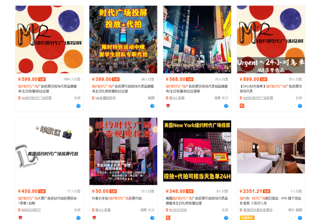现在的淘宝上,时代广场的代投屏业务在三百至五百元不等,有不少都是在当地的留学生在经营,并且还会非常贴心地把你的视频在时代广场的画面记录下来,方便你回到国内装逼,服务不可谓不周到。