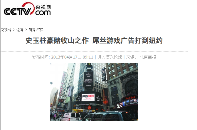 无意之中,时代广场也成了大佬史玉柱的垫脚石,帮巨人网络把它旗下的《仙侠世界》以“屌丝OnLine”的名声宣扬到了全世界。
