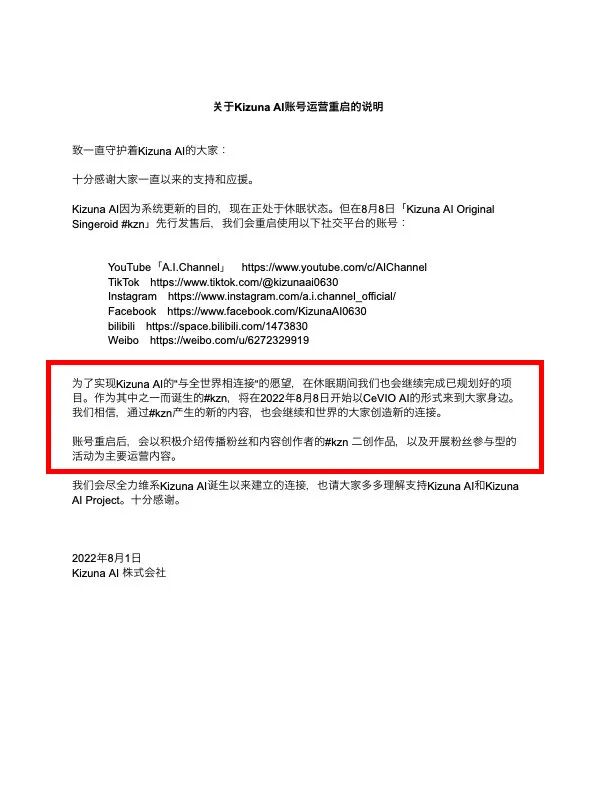 而就在八月的第一天,绊爱的运营团队发布了一则声明,称将恢复绊爱相关的社交账号的运营,似乎仅仅时隔半年,爱酱就要顶不住粉丝们的思念,苏醒回归了。然而实际上,恢复社交账号并不是为了迎接爱酱,而是为了宣发一个新的企划——#kzn。