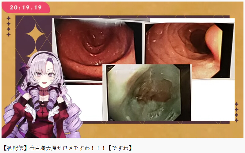 要么就得够狠,就像今年五月份刚刚出道的彩虹社超级新人“一百满天原莎乐美”,在首播自我介绍的环节,说想让大家看看自己的内在——然后直接掏出了自己的胃镜照片。