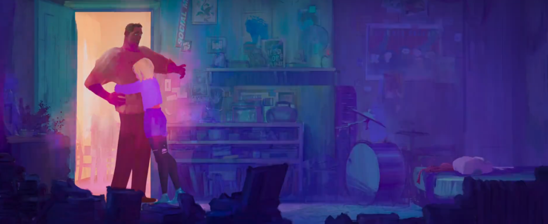 不拘泥于传统的分镜,脱胎于漫画的表现形式,高对比度的大块色彩渲染,以及抽帧的电影呈现方式。这些元素结合,让《蜘蛛侠:平行宇宙》成了动画电影年级里最特立独行的那个学生。