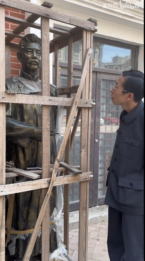 上一秒,他站在被保护(也可以解读成被囚禁)的鲁迅先生雕像前,端详许久。