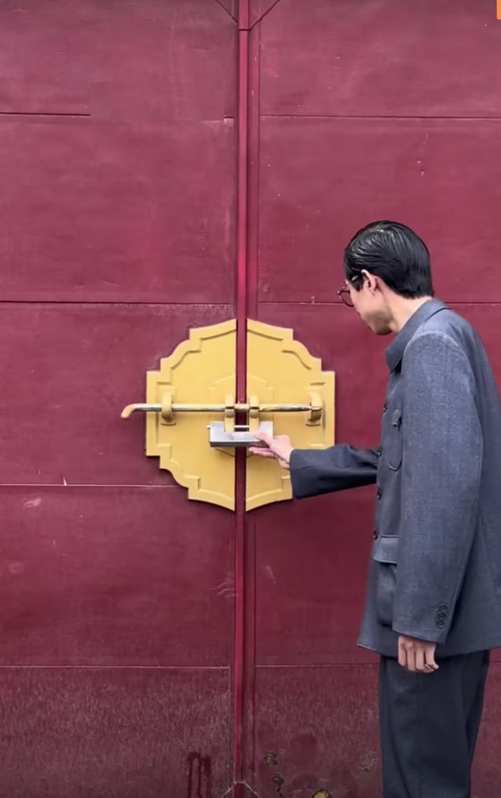 就像是电影《末代皇帝》中推开紫禁城门、却发现门外已是日月换新天一般,姜阿四的视频常常传达出这种错位的荒诞。他的团队太知道该如何把控镜头语言,电影质感的调色、无法进入的古老建筑、或悠闲或忙碌的人群以及不属于这里的自己……每一幕都散发着精心构筑的对立感。