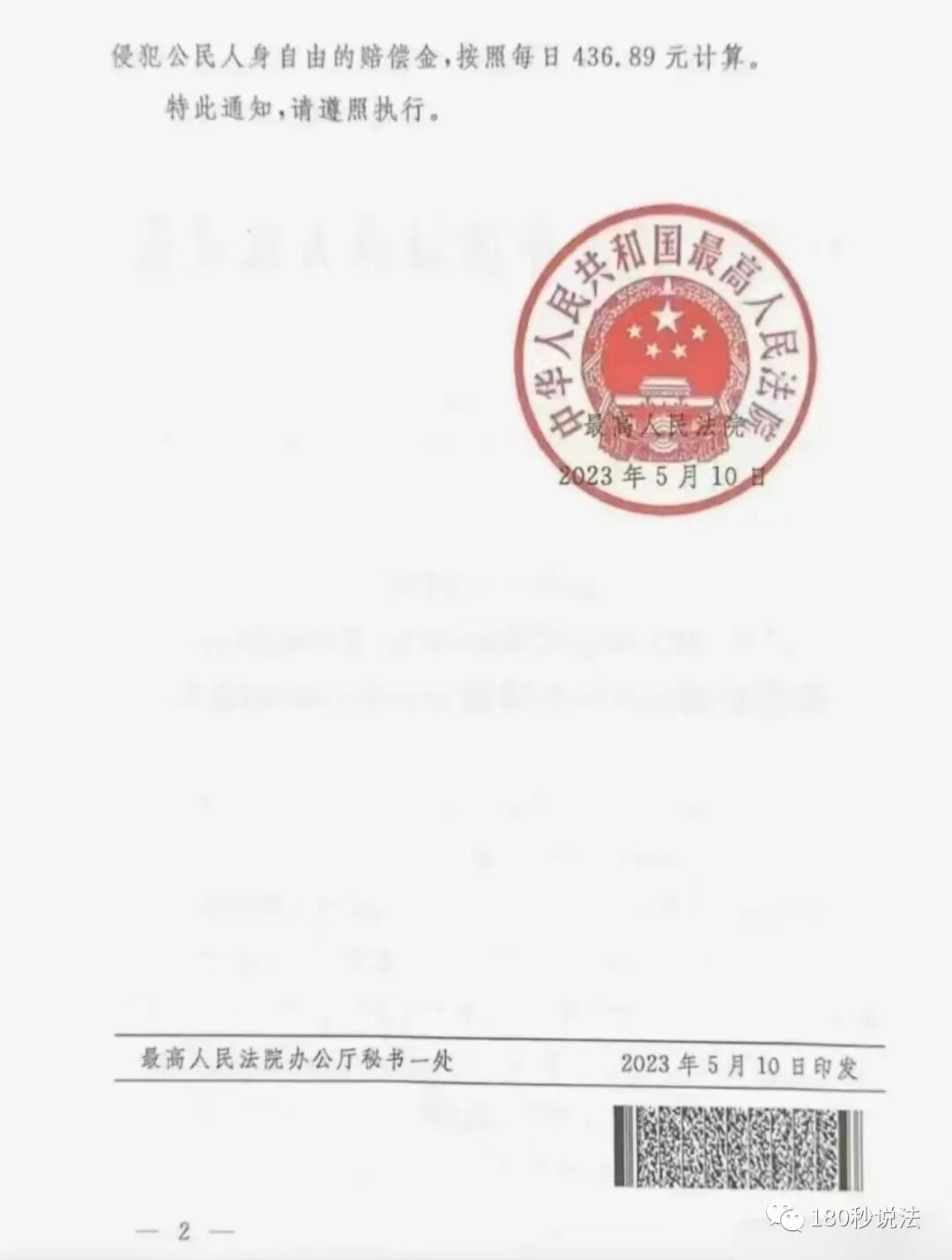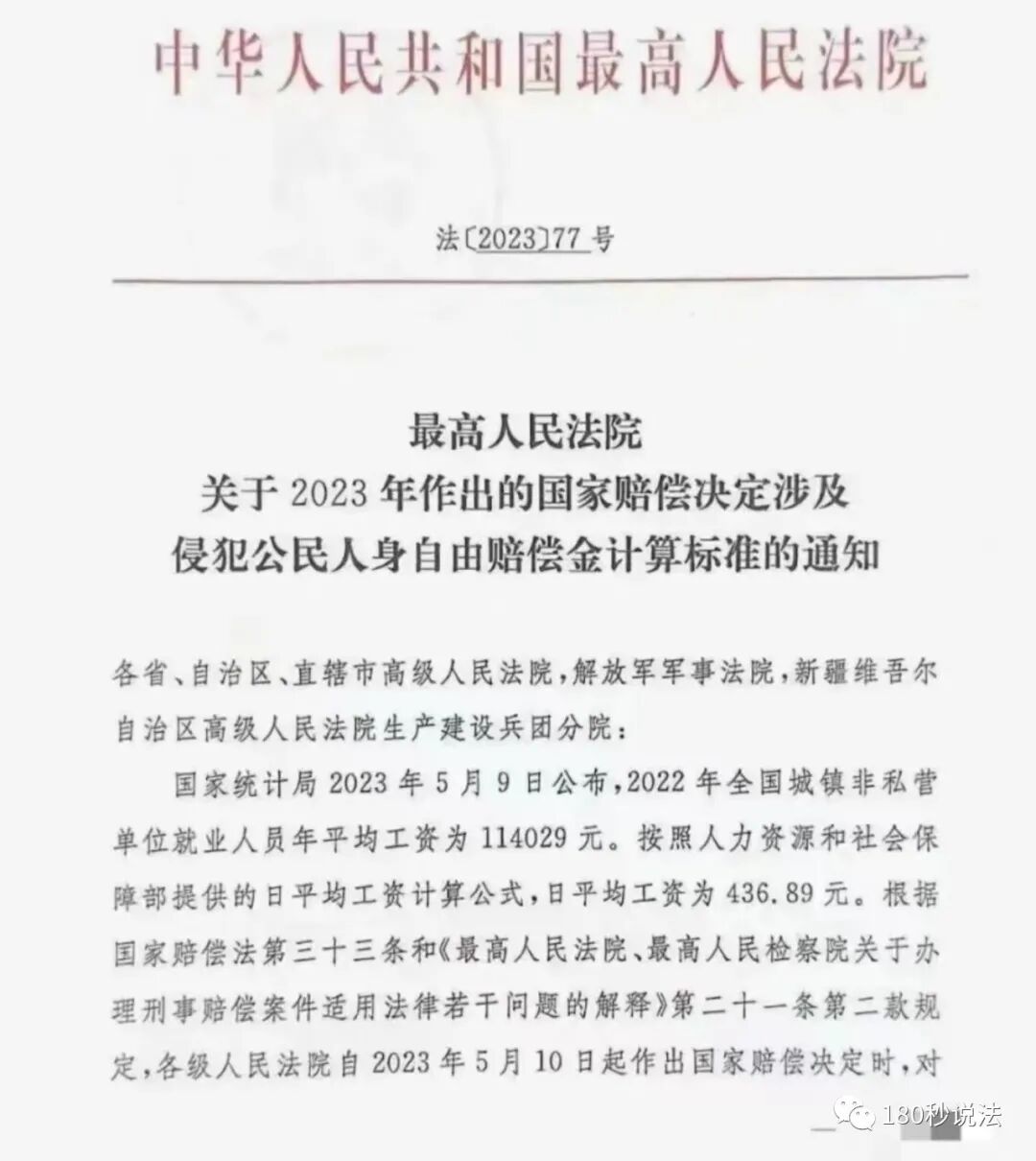 最高法2023年5月10日发布通知,自2023年5月10日起作出国家赔偿决定时,对侵犯公民人身自由的赔偿金按照每日436.89元计算。