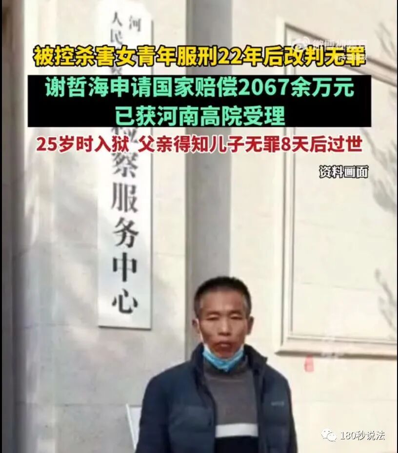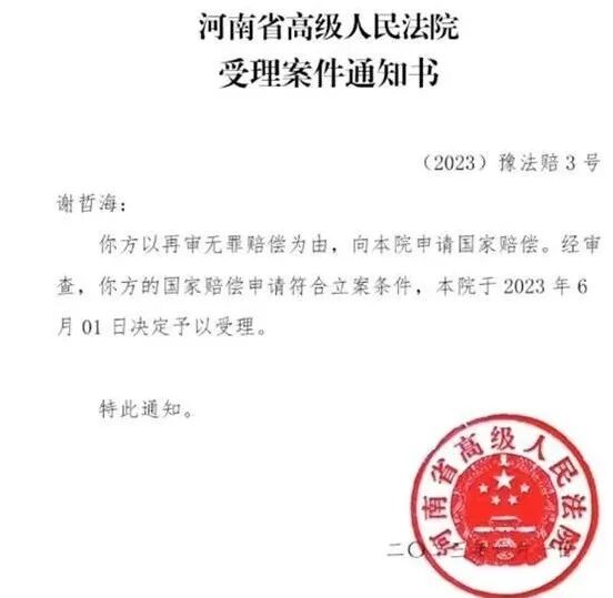 2023年6月1日,河南省高级人民法院受理谢哲海20672785.81元国家赔偿申请。