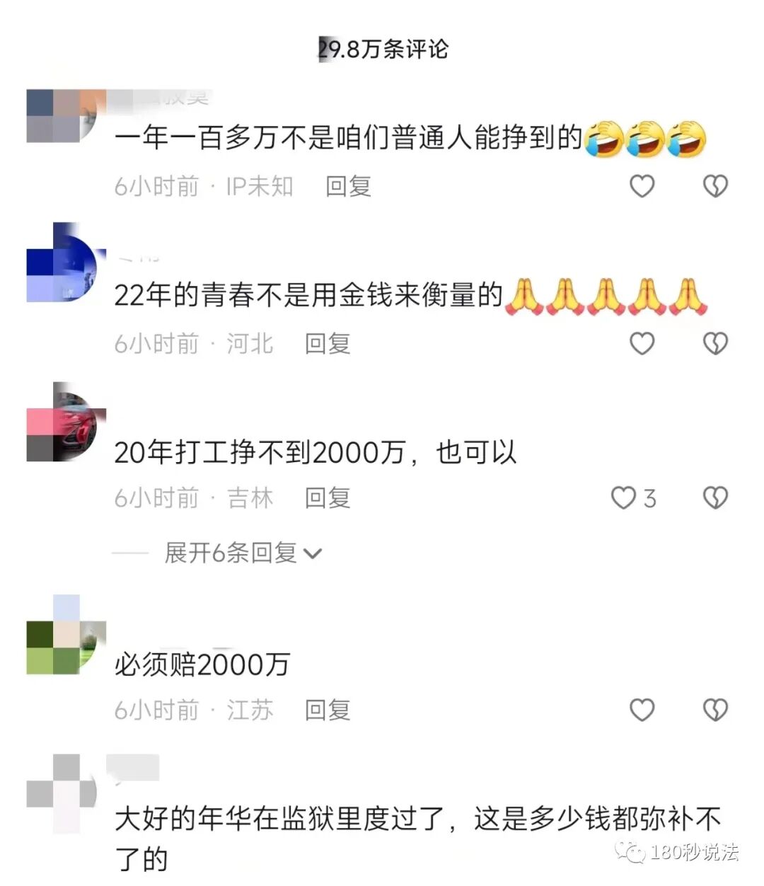 有网友评论说“20年打工挣不到2000万,也可以”,也有网友反驳道“22年的青春不是用金钱来衡量的”。作者认为,就算国家真赔偿了两千万又怎样,22年的牢狱生活,背上22年的杀人犯罪名,真不是普通人能够承受的。更何况也赔偿不了那么多,可参考此前张玉环案,27年赔了496万元。