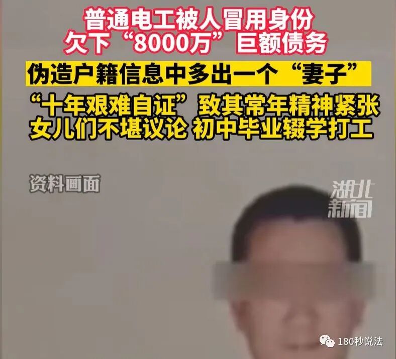 刘汉廷吓得赶忙前往银行弄清原由,果然到了之后发现银行系统中自己身份证上的照片竟然是陌生面孔,各类债务累计近8000万元!而且除此之外,信息上还显示自己的老婆也变了,是一个姓董的女人,另外还有两个儿子。刘汉廷哭笑不得,自己没有在外面沾花惹草,怎么可能凭空多个老婆孩子?